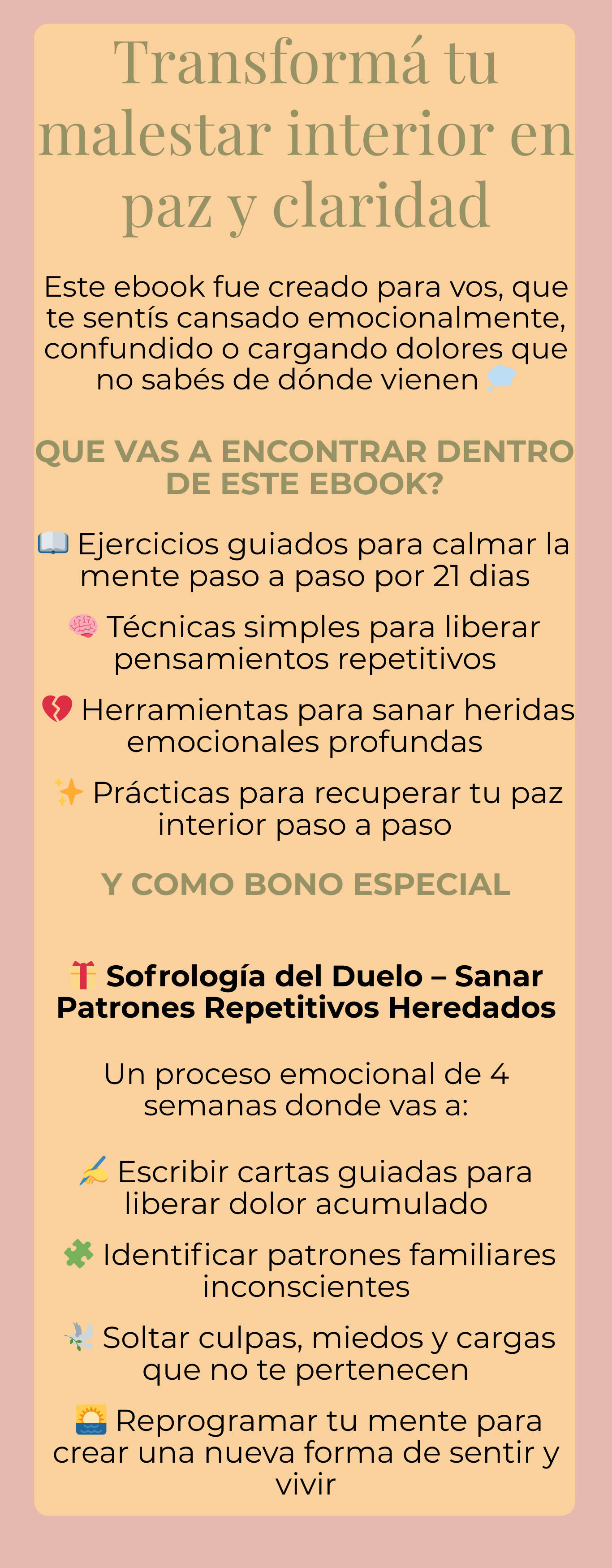 Sí. Este camino fue creado para quienes sienten un peso en el pecho, un cansancio emocional o una herida que todavía no termina de cerrar. A través de prácticas espirituales y ejercicios emocionales simples, vas a comenzar a liberar lo que te bloquea y reconectar con tu calma interior.